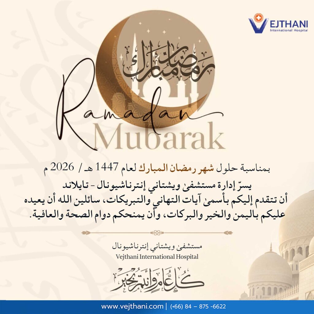 ها هي نسمات الشهر الفضيل تهل علينا من جديد، حاملة معها أريج الرحمة والغفران والعتق من النيران. يسرنا في إدارة مستشفى ويشتاني إنترناشيونال ، في مملكة تايلاند، أن نتقدم إليكم جميعاً بأسمى آيات التهاني وأصدق المشاعر بمناسبة حلول شهر رمضان المبارك لعام 1447 هجرية، الموافق لعام 2026 ميلادية.