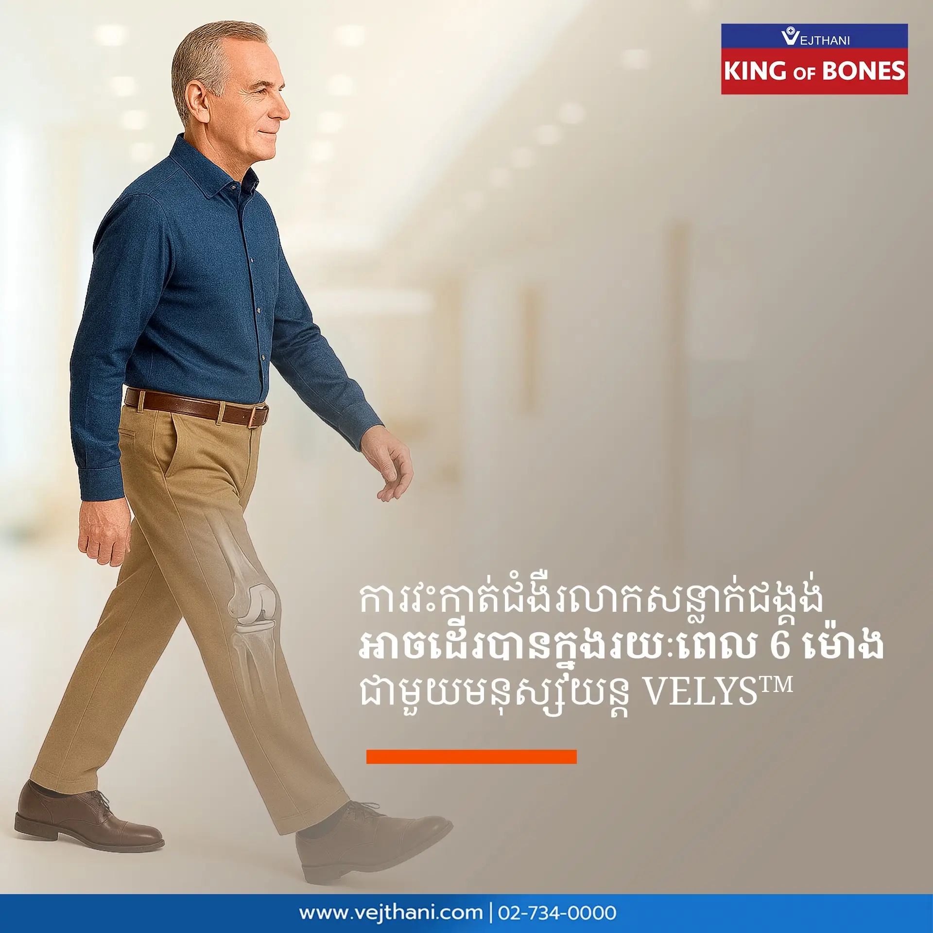 ការវះកាត់ជង្គង់ទំនើបមិនត្រឹមតែ “ផ្លាស់ប្ដូរសន្លាក់” ប៉ុណ្ណោះទេ ប៉ុន្តែគឺជា “ការស្តារគុណភាពជីវិតឡើងវិញ” ដែលជួយឱ្យអ្នកជំងឺត្រលប់មកធ្វើចលនាបានដោយទំនុកចិត្តឡើងវិញម្ដងទៀត ដោយបច្ចេកវិទ្យា VELYS™ Robotic-Assisted Solutions (VRAS) ដែលជាមនុស្សយន្តជំនាន់ទី 4 ដែលផ្តល់ឱ្យគ្រូពេទ្យវះកាត់នូវការវះកាត់ដែលមានភាពជាក់លាក់ សុវត្ថិភាព និងបំពេញតម្រូវការបែបបុគ្គល