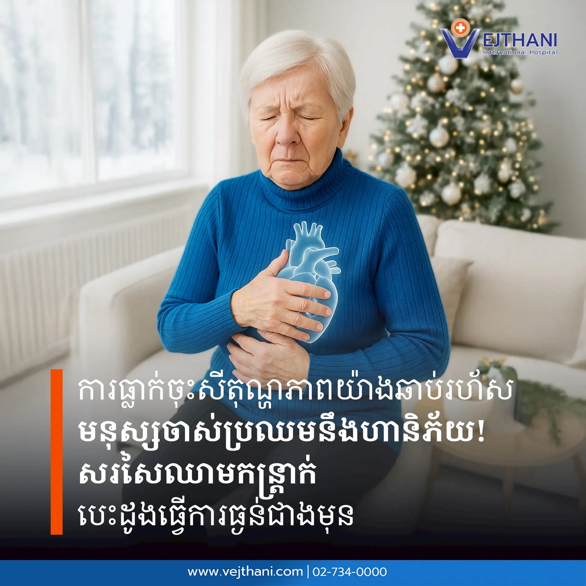 នៅពេលដែលរដូវរងាជិតមកដល់ មនុស្សជាច្រើនរីករាយនឹងអាកាសធាតុត្រជាក់ដោយមិនដឹងថា “ការធ្លាក់ចុះនៃសីតុណ្ហភាព” អាចប៉ះពាល់ដល់មុខងារសរសៃឈាមបេះដូងរបស់ពួកគេ។ ការសិក្សាជាច្រើនបានបញ្ជាក់ថា អត្រានៃការគាំងបេះដូង (Heart Attack) មានទំនោរកើនឡើងក្នុងអំឡុងពេលអាកាសធាតុត្រជាក់
