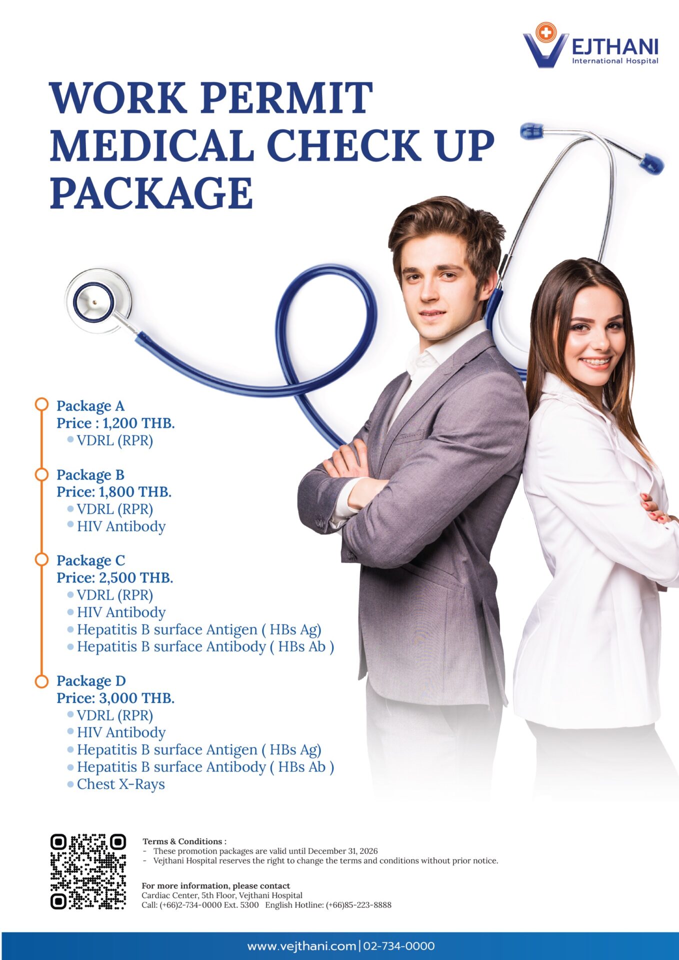 To get your work permit application successfully, a medical check up with medical certificate is required. Vejthani Hospital offers you a Work Permit Package as follows: