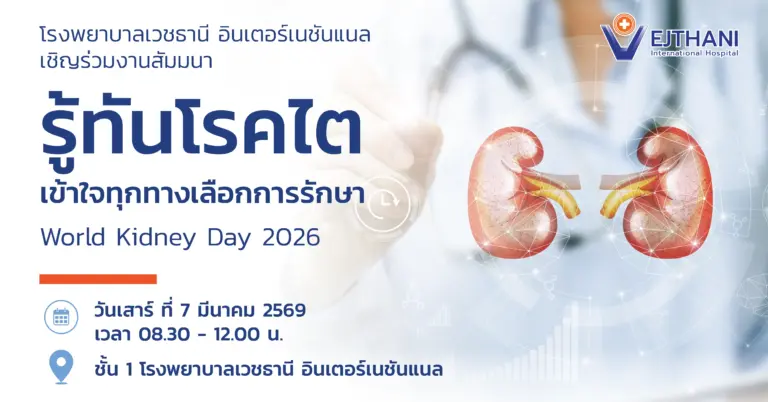 เพราะ “โรคไต” ใกล้ตัวมากกว่าที่คุณคิด โรงพยาบาลเวชธานี อินเตอร์เนชันแนล เชิญร่วมงานสัมมนา “รู้ทันโรคไต เข้าใจทุกทางเลือกการรักษา” World Kidney Day 2026 เปิดพื้นที่แห่งความรู้ ร่วมทำความเข้าใจเกี่ยวกับโรคไต พร้อมทางเลือกการรักษาอย่างถูกต้อง โดย ทีมแพทย์ผู้ชำนาญการโรคไต โรงพยาบาลเวชธานี อินเตอร์เนชันแนล เปิดมุมมองประสบการณ์จริงจากผู้เข้ารับการปลูกถ่ายไตและประสบความสำเร็จ โดย “คุณทนายเกิดผล แก้วเกิด”ภายในงานพบกับ โดยพยาบาลแผนกไตเทียม ตรวจโปรตีนในปัสสาวะ โดยนักเทคนิคทางการแพทย์📅 วันเสาร์ที่ 7 มีนาคม 2569⏰ เวลา 08.30 – 12.00 น.📍 ชั้น 1 โรงพยาบาลเวชธานี อินเตอร์เนชันแนล🎯 เข้าร่วมงานฟรี!! วิธีการลงทะเบียน ลงทะเบียนเข้าร่วมงานผ่าน QR Code หรือ ลิงก์ https://forms.gle/EZzEQ9SVg26U4rud8ดูแลไตตั้งแต่วันนี้ เพื่อคุณภาพชีวิตที่ดีในระยะยาว ติดต่อสอบถามข้อมูลเพิ่มเติม ศูนย์ไตเทียม โรงพยาบาลเวชธานี อินเตอร์เนชันแนลโทร. 02-734-0000 ต่อ 5021