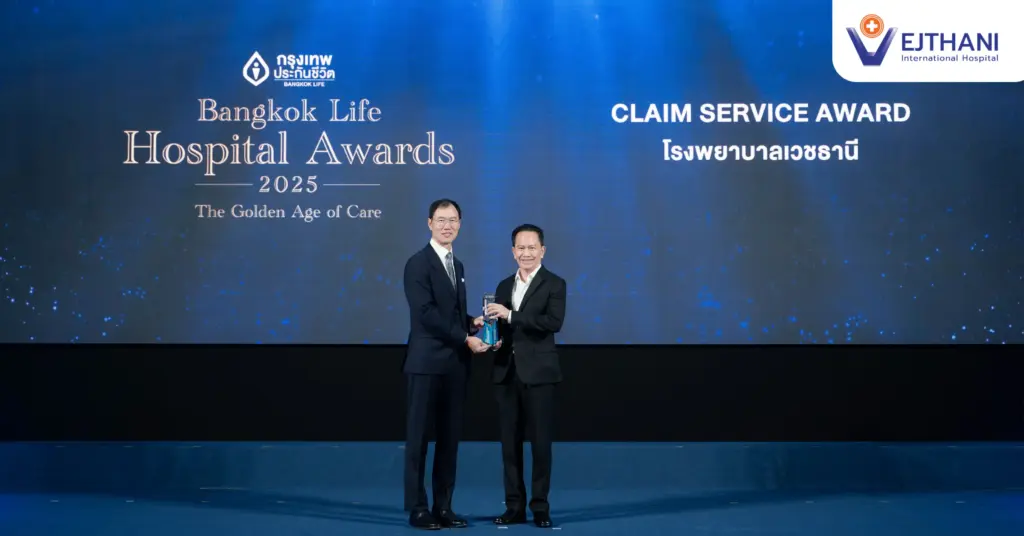 ดร.นพ.ตุลวรรธน์ พัชราภา ผู้อำนวยการปฏิบัติการ โรงพยาบาลเวชธานี อินเตอร์เนชั่นแนล เป็นตัวแทนขึ้นรับรางวัล Bangkok Life Hospital 2025 ด้านการประสานงานและบริหารจัดการสินไหมยอดเยี่ยม